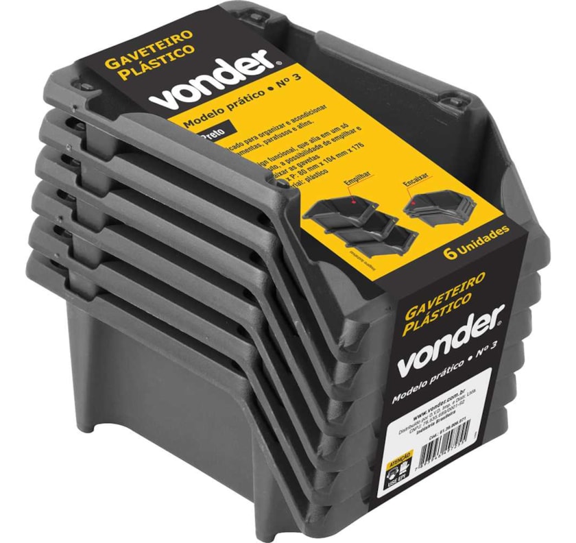 Facilita a organização de pequenos itens. O diferencial desse novo modelo é seu design, que alia em um só produto, a possibilidade de empilhar e encaixar as gavetas. Elas podem ser empilhadas uma em cima da outra (para exposição e uso, por exemplo) e também encaixadas uma dentro da outra (tornando seu transporte e armazenamento muito mais econômicos pela otimização do espaço ocupado, se comparada a um gaveteiro tradicional). Seu formato também contribui para maior resistência e durabilidade do produto.